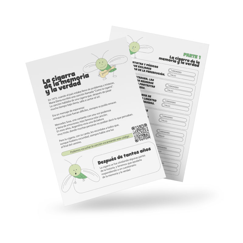Podrán descargar un texto con la historia de la canción “Como la cigarra”, escrita por María Elena Walsh y popularizada por Mercedes Sosa, junto con una actividad de verdadero o falso para responder después de la lectura. El material está pensado para contextualizar el período de la Dictadura a través del arte y la música como forma de memoria y resistencia.